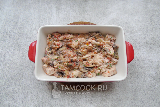 Перемешайте все ингредиенты и выложите в жаропрочную форму.