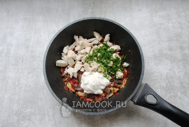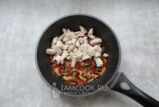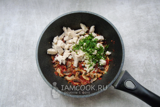 Куриное филе отварите или пожарьте, охладите и нарежьте небольшими кусочками. Выложите в сковороду с грибами и помидором. Напомню, как варить куриное филе. Выложите его в кастрюлю, залейте водой. Доведите до кипения. Затем огонь убавьте и снимите пену. Варите куриное филе 15-20 минут, до мягкости.