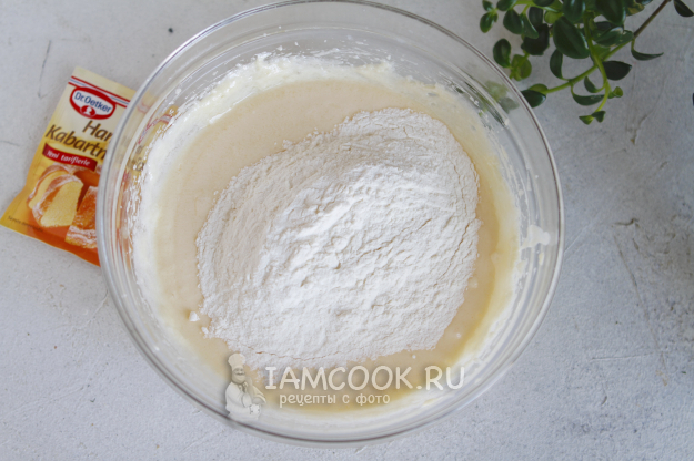 Муку просеять. Соединить сухие ингредиенты между собой, размешать и добавить в чашу.