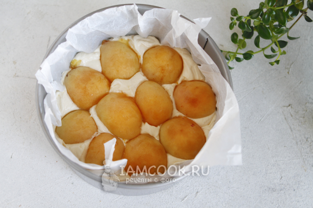 Подготовьте абрикосы. Вымойте их, обсушите и каждый разделите на половинки. Сверху выложите половинки абрикосов.
