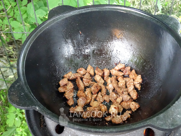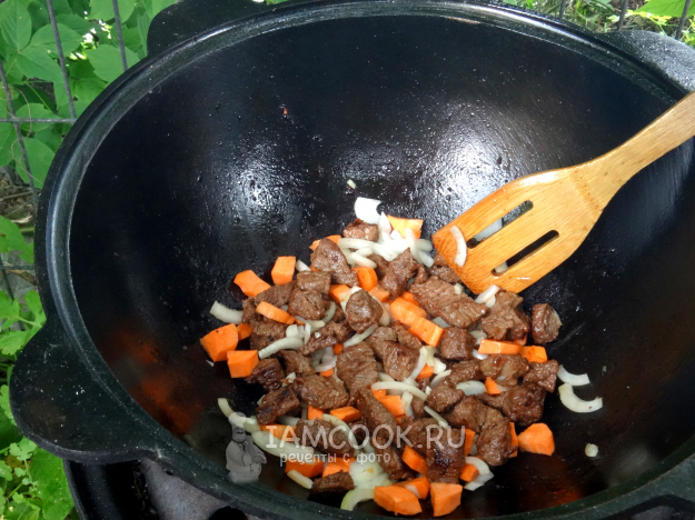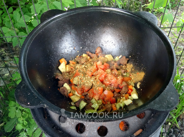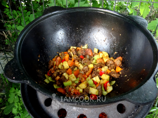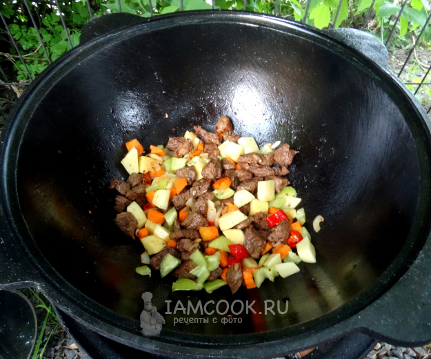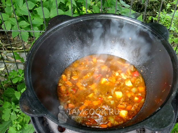 Накрыть крышкой и готовить лагман из говядины в казане на костре на медленном огне до готовности картофеля.