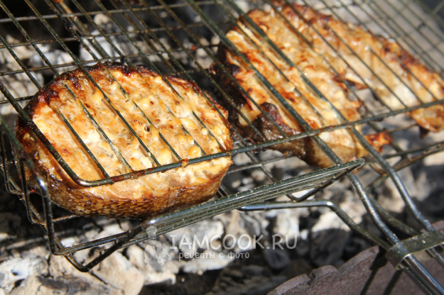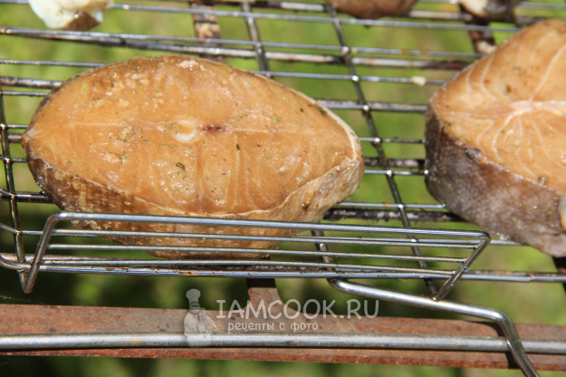 Жарить стейки трески на мангале с подготовленными углями. Решетку часто переворачивать, жарить примерно по 5-7 минут с каждой стороны, до золотистого цвета.