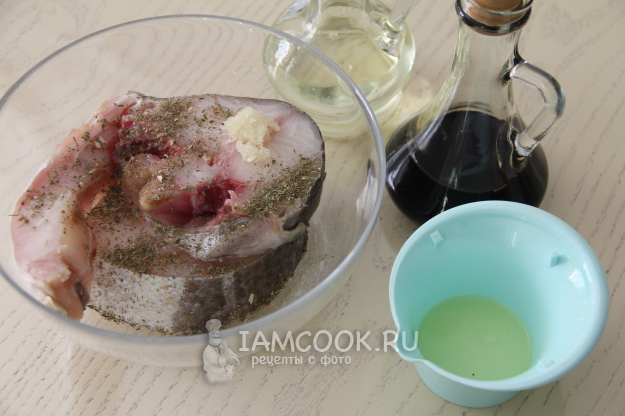 Соберите продукты для приготовления стейков трески на мангале. Стейки трески предварительно разморозить при комнатной температуре.