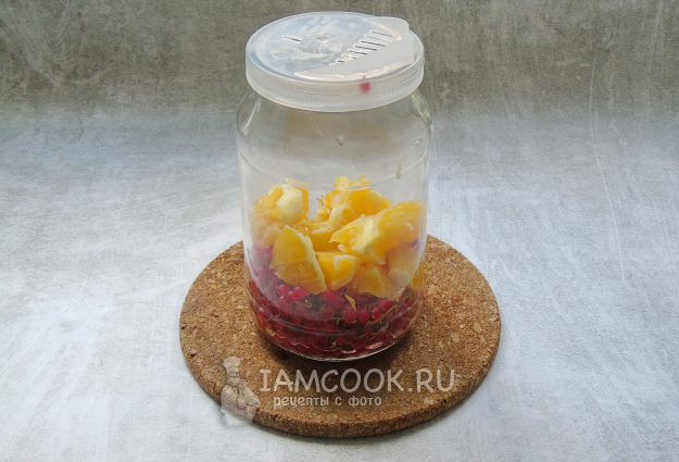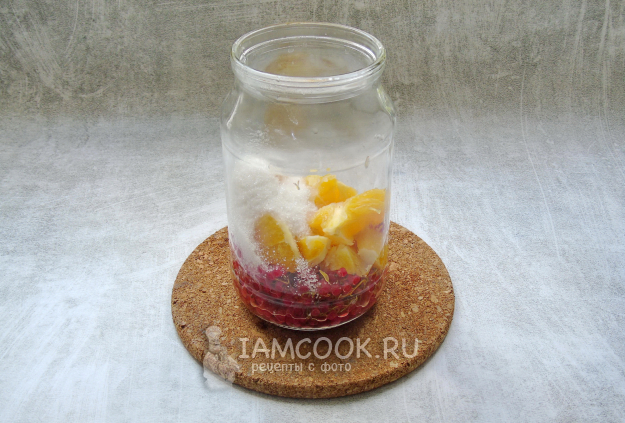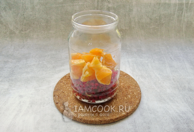 Апельсин помойте, очистите от кожуры. Нарежьте и уберите косточки. Добавьте в банку с красной смородиной. Если вам нравится горчинка апельсина в компоте, то можно цитрус не чистить.