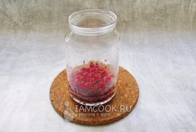 Красную смородину помойте, уберите листики, а веточки можно оставить. Выложите смородину в чистую стерилизованную банку.