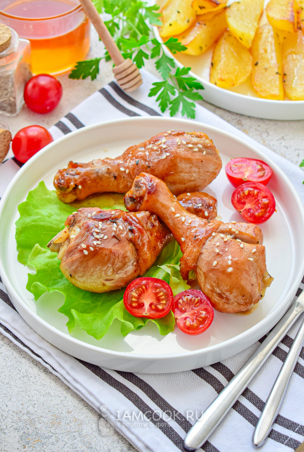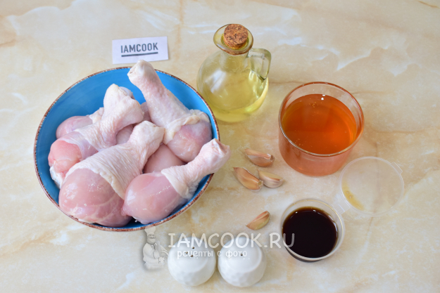 Для приготовления куриных голеней с медом на сковороде соберите необходимые ингредиенты по списку. Если мед у вас засахаренный, то можно погреть его в микроволновой печи до жидкого состояния.
