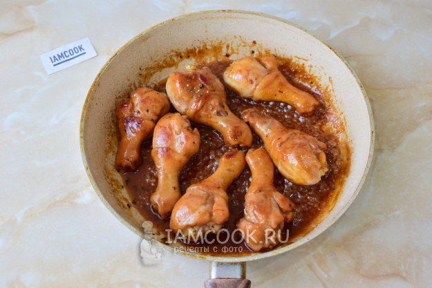Тушите куриные голени с медом на сковороде на небольшом огне 20-30 минут. Периодически переворачивайте мясо, чтобы оно готовилось более равномерно. Постепенно голени станут карамельного цвета.