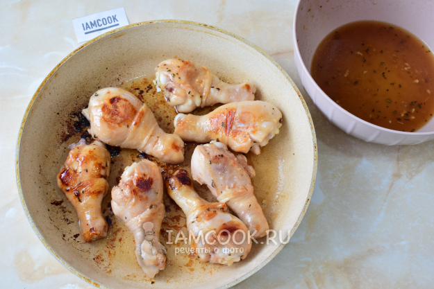 В оставшийся маринад добавьте немного воды и залейте голени в сковороде.