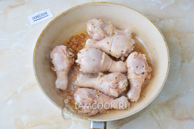 Для жарки разогрейте сковороду до горячего состояния и налейте на неё растительное масло. Выложите голени и обжарьте их со всех сторон, чтобы мясо поменяло цвет.