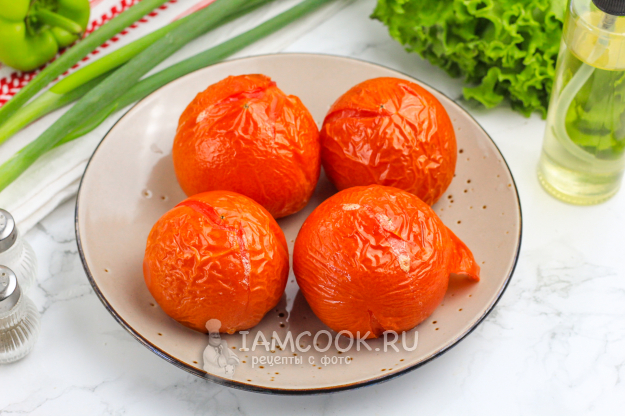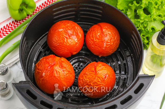 Активируйте на табло техники режим 180 градусов и запеките помидоры в аэрогриле в течение 20 минут. Время приготовления напрямую будет зависеть от величины томатов и мощности вашей техники. Когда помидоры станут мягкими, но не размякшими - они готовы.