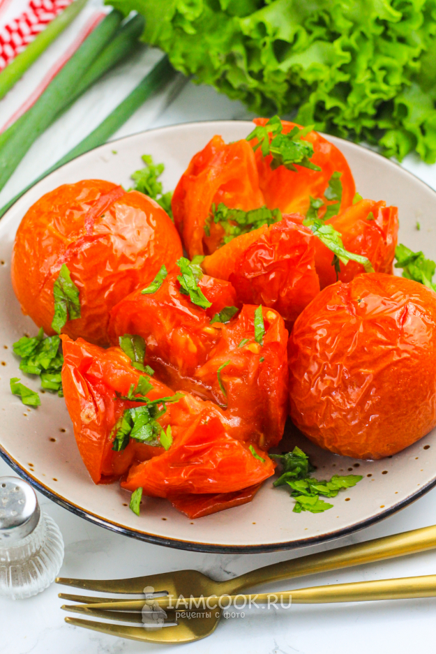 По желанию разрежьте плоды на четыре части и присыпьте измельченной петрушкой, солью. Если любите свежий чеснок, то можете спрессовать очищенный зубчик прямо на помидоры. Сбрызните растительным маслом и подайте приготовленные в аэрогриле помидоры к столу теплыми.