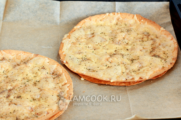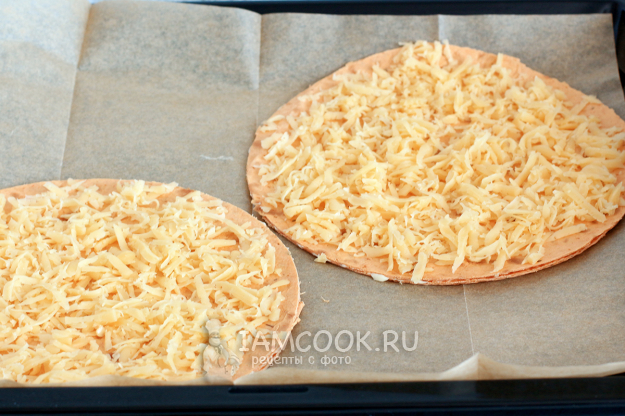 Поверхность лепешек посыпьте тертым сыром. Отправьте в разогретую до 220 градусов духовку на 7-10 минут. Нужно, чтобы края лепешек зарумянились и подсохли, а сыр хорошенько расплавился. Ориентируйтесь по своей духовке, все они пекут по-разному.