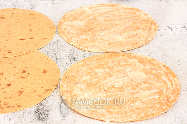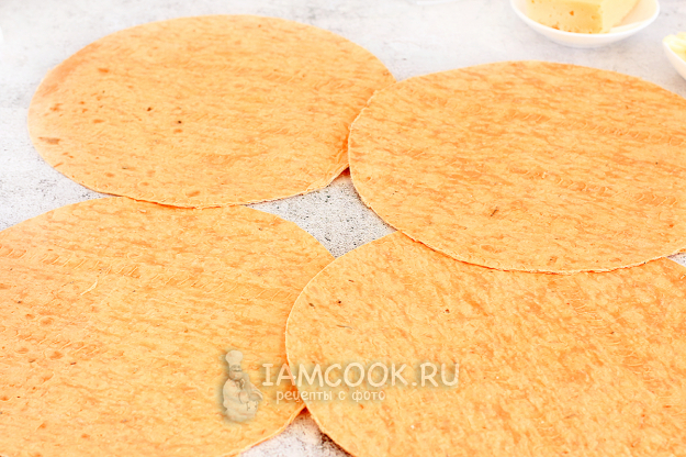 Вырежьте круглые лепешки с помощью тарелки. Но вообще, можно не заморачиваться и приготовить квадратные лепешки))