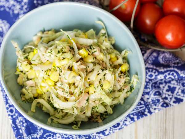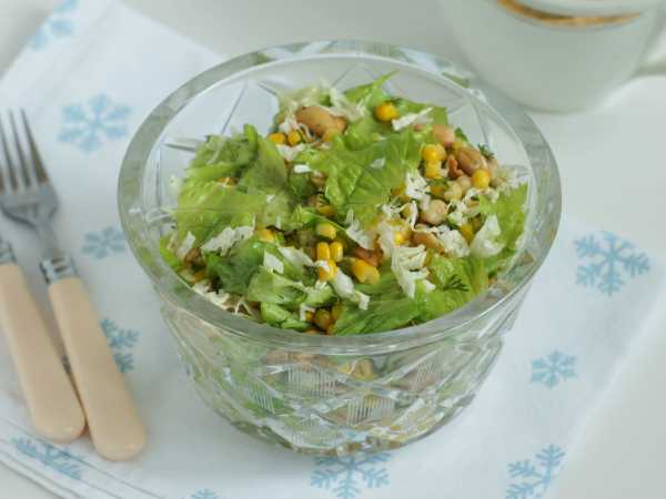 Для приготовления овощного салата с кукурузой (консервированной) соберите продукты по списку.