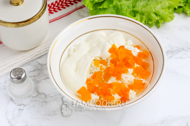 Выложите 200 г творога в пиалу, добавьте сметану, 2 ч.л. сахарного песка и измельченную курагу. Как следует перемешайте, и вторая начинка готова!