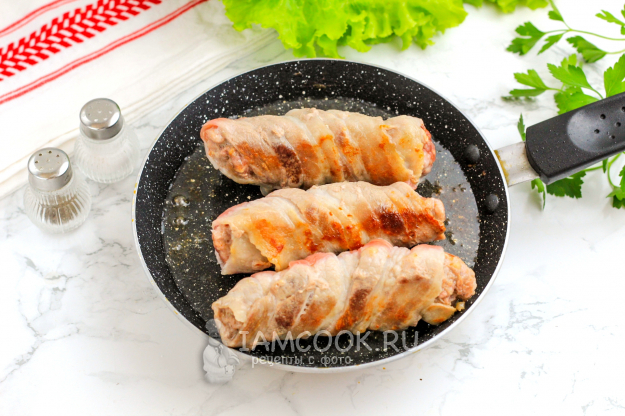Прогрейте сковороду на плите и влейте на нее растительное масло. Выложите колбаски в беконе и обжарьте около 3-4 минут на среднем нагреве, до румяности.