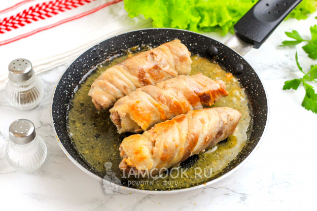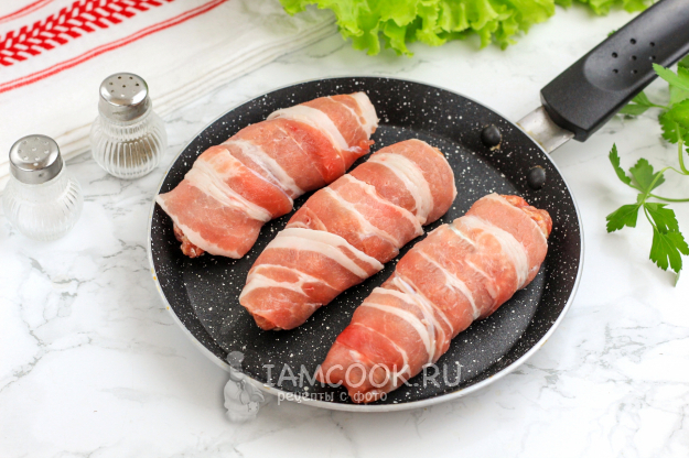 Оберните ее в ленту бекона. Если он с полоской кожи, то ее лучше срезать.