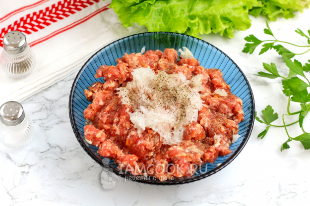 В мясной фарш натрите половинку очищенной луковицы на терке с мелкими ячейками. Всыпьте соль и молотый черный перец. Тщательно перемешайте всё и отбейте в течение 2-3 минут, беря фарш в ладонь и кидая его обратно в емкость. Таким образом волокна фарша схватятся между собой и удалятся пузырьки воздуха.