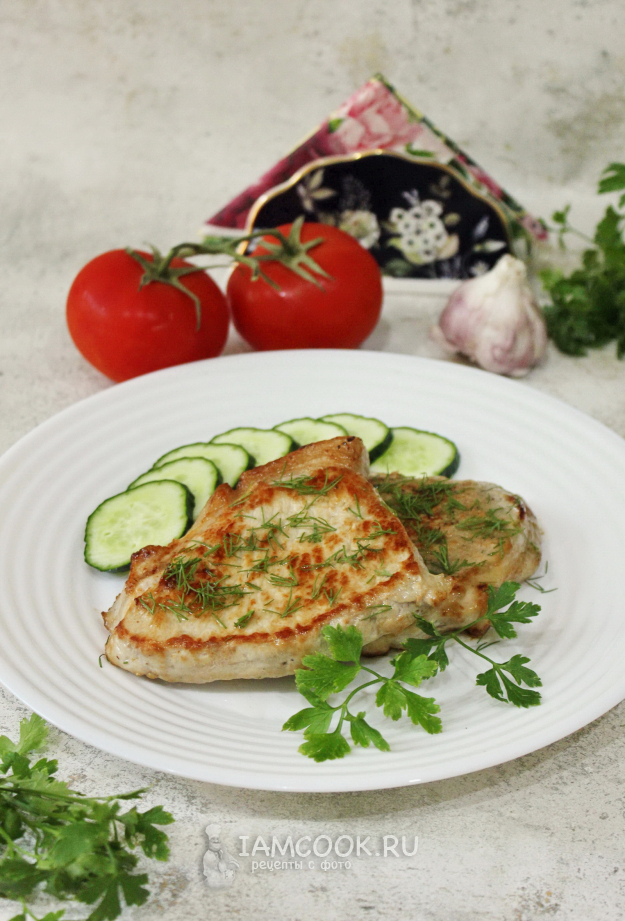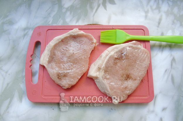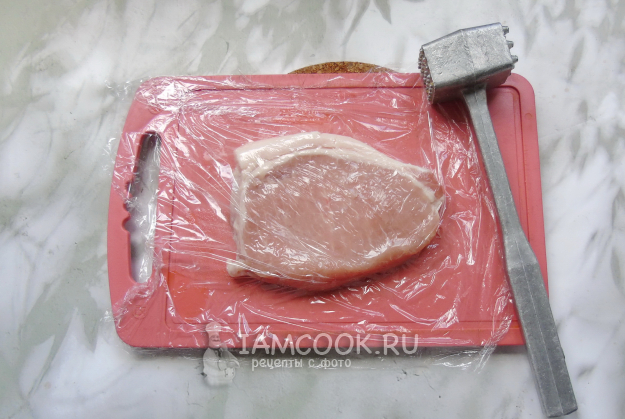 Свинину помойте, обсушите бумажным полотенцем и нарежьте поперек волокон порционными кусками толщиной 1,5-2 сантиметра. Каждый кусок накройте пленкой и слегка отбейте молоточком. Важно не превратить мясо в тонкую отбивную, а только сделать мягче верхние мясные волокна.