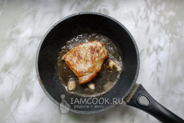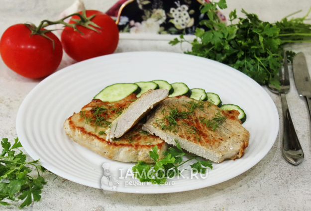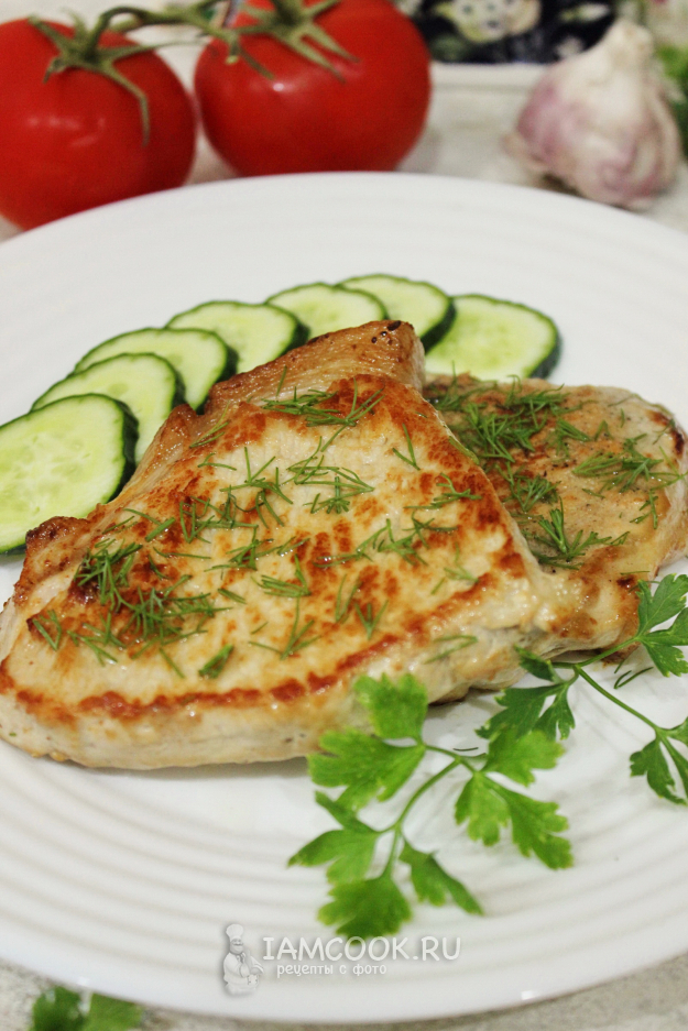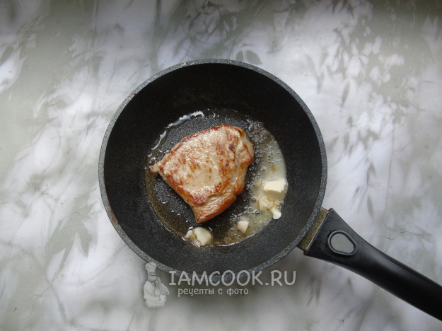 Убавьте огонь до минимума и жарьте свинину по 4 минуты с каждой стороны. Сковороду накрывать крышкой не нужно. Проколите мясо ножом или вилкой. Если сок, который выделится, будет светлым, то бифштекс готов.