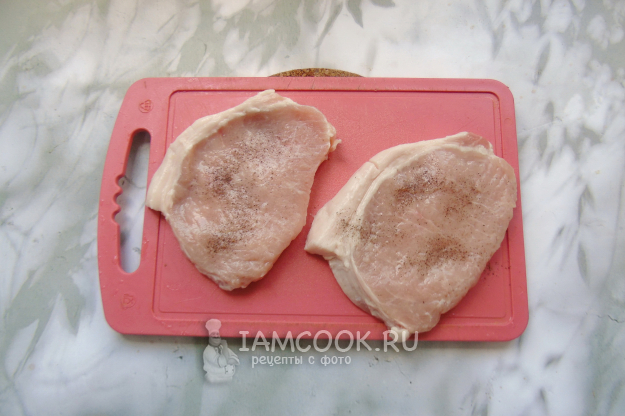 Поперчите свинину. Солить пока не нужно. Во время жарки соль будет способствовать выделению мясного сока, что сделает бифштекс сухим.