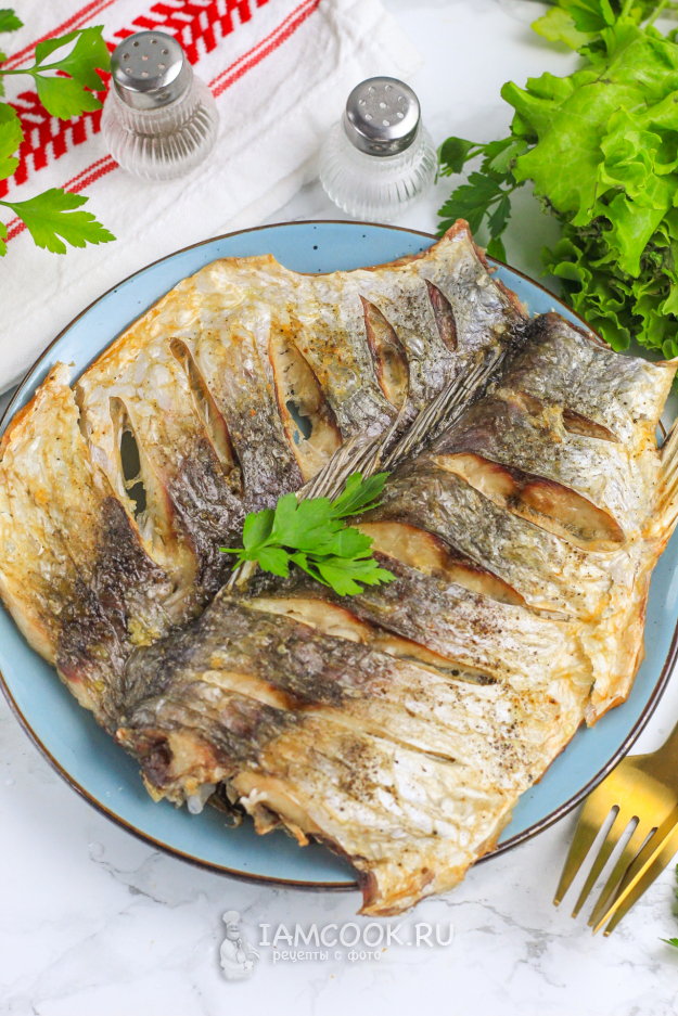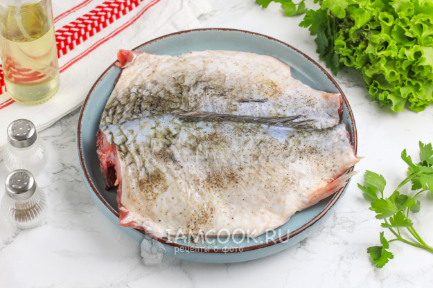 Срежьте голову, хвосты и плавники - их используйте для приготовления ухи или рыбного супа. Тушку разрежьте снизу, раскрывая ее как книжку. Обсушите бумажными салфетками.