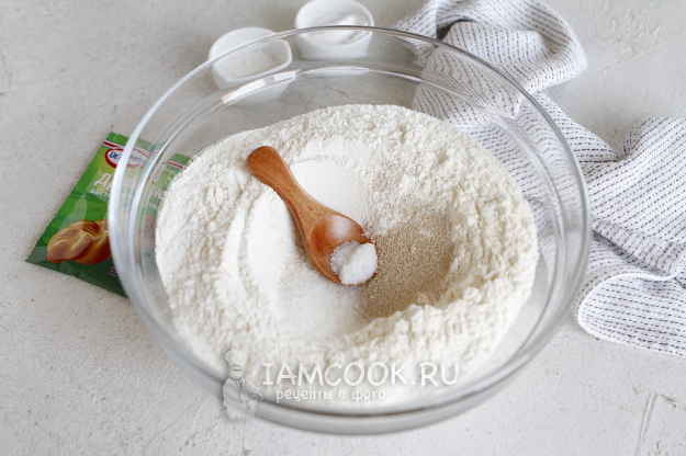 В чаше с мукой сформировать лунку, добавить все сухие ингредиенты: сухие дрожжи, сахар и соль (дрожжи можно использовать как сухие, так и живые).