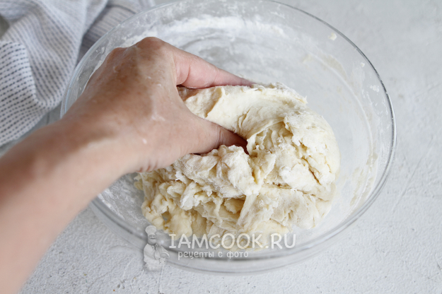 А потом вымесила тесто вручную. Тесто получится мягким, будет слегка прилипать к рукам.