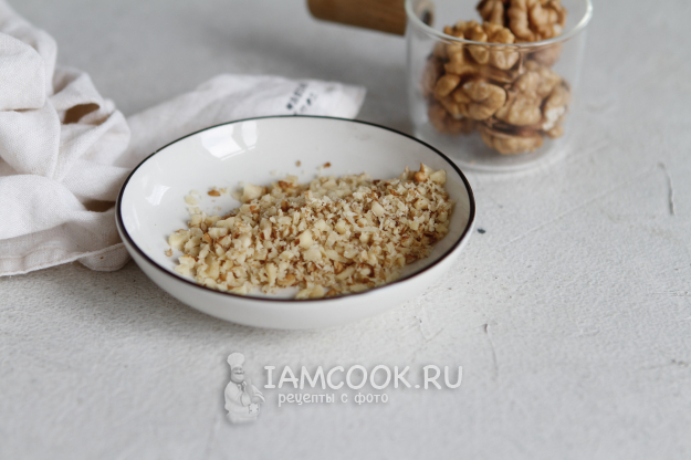 Измельчить грецкие орехи в чаше блендера или порубить ножом, но не превращать их в порошок, это важно.