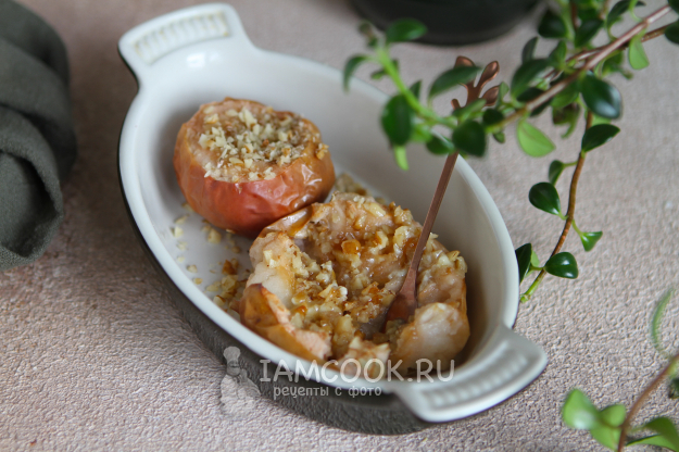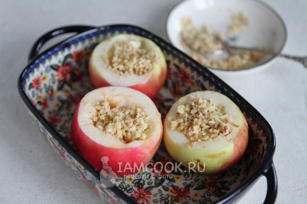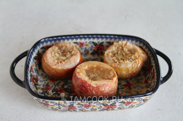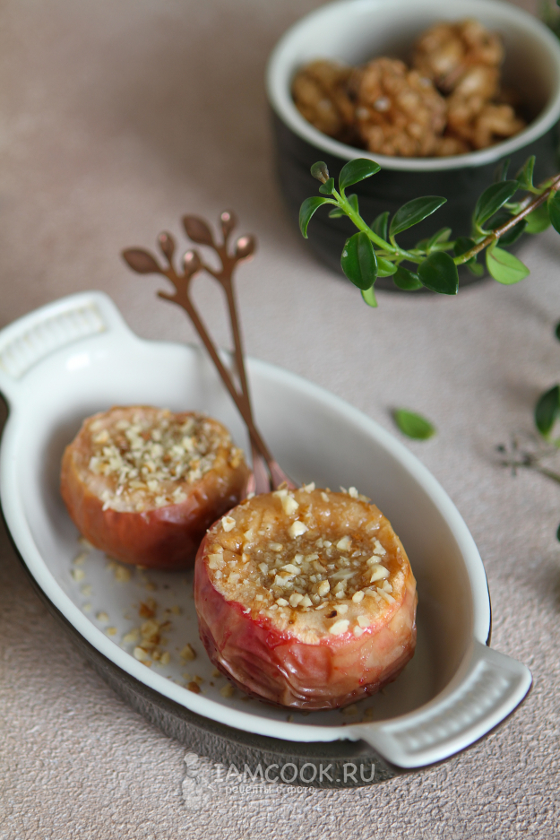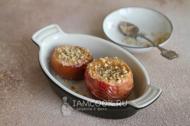 Когда яблоки будут готовы, достать их, переложить в блюдо и перед подачей присыпать еще раз грецкими орехами.