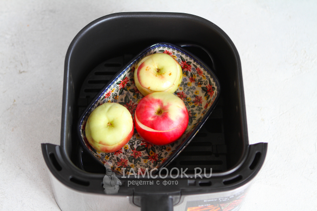 Отправляем яблоки в корзину аэрогриля. Я запекала яблоки в форме, но, в принципе, можно вполне обойтись без нее. Выбрала я ее только для своего удобства, чтобы после запекания не мыть корзину аэрогриля.