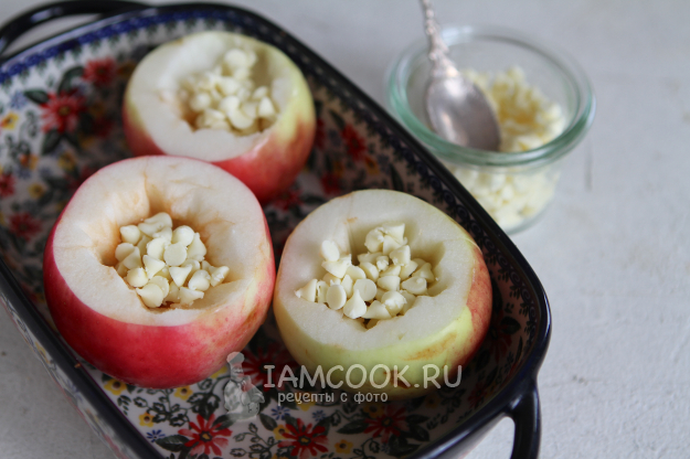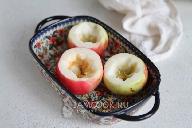Мякоть яблок я не использовала, но ее можно измельчить, добавить к ней, например, орехи, изюм и зафаршировать яблоки. Для удобства подготовленные яблоки я переложила в форму для запекания.