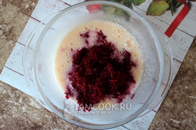 Сырую свёклу мелко натрите и вмешайте в пышную яично-масляную массу.