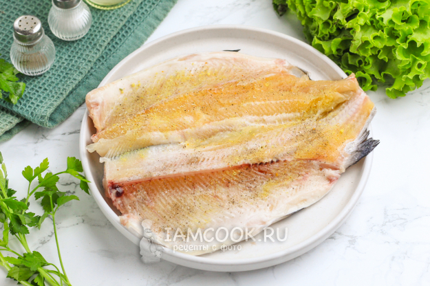 Посолите и поперчите, присыпьте выбранной вами приправой. Слегка вотрите специи в мякоть. По желанию рыбку можно замариновать заранее (за 30-60 минут) в лимонном соке и специях, в соевом соусе и т.д.