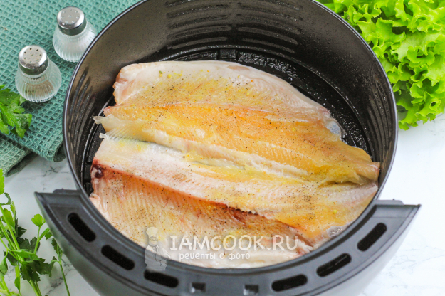 Сбрызните маслом поддон аэрогриля и выложите рыбу кожицей вниз.