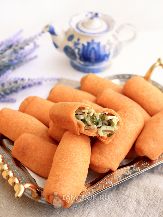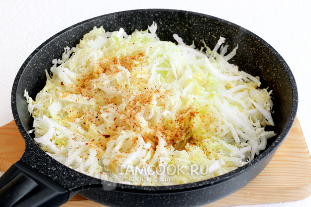 Пекинскую капусту нарежьте мелко. Ее можно просто обдать кипятком, но я решила чуть потомить её в сковороде с ложкой масла и ложкой воды. Огонь при этом слабый. Капуста очень быстро оседает и становится мягкой. Для белокочанной времени понадобится больше. Следите, чтобы на дне сковороды совсем не осталось жидкости. Посолите капусту по вкусу, добавьте любимые специи или просто черный молотый перец. Я добавила кавказскую ореховую приправу с черным перцем.