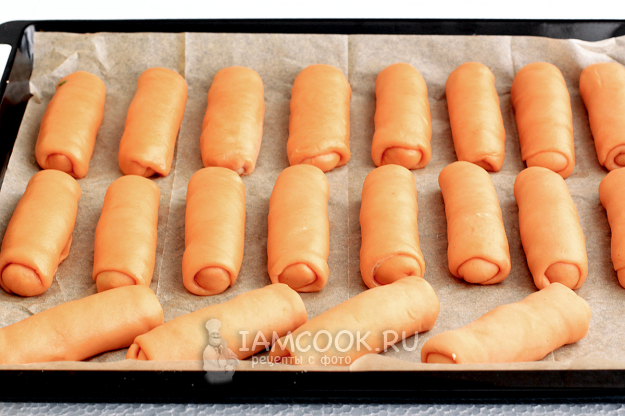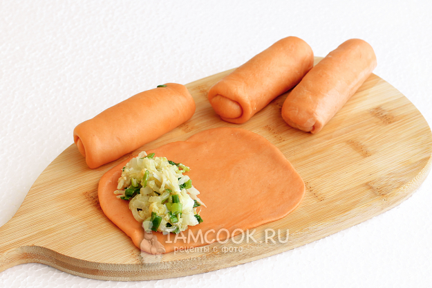 Каждый шарик нужно раскатать в овал шириной 10 см, а длина должна быть примерно 20 см. Желательно место, куда будете выкладывать начинку, сделать чуть толще, а края - тоньше. Начинку выложите на утолщенный край теста, прижмите и заверните рулончиком. Боковые части теста подверните внутрь сразу же, на первом витке. У вас должно получиться не менее двух оборотов, иначе тесто может лопнуть при выпечке.