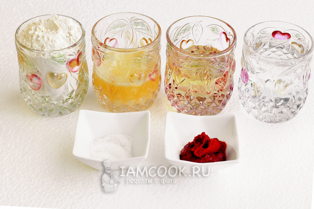 В теплой воде растворите соль и сахар. Добавьте томатную пасту и размешайте. Затем влейте растительное масло и растопленное сливочное.