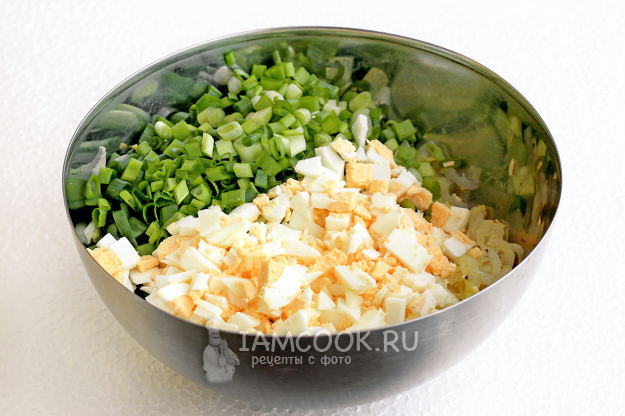 Остудите капусту в миске, добавьте зеленый лук и рубленые вареные яйца. Перемешайте, попробуйте на соль - если нужно, то досолите еще. Начинка к пирожкам готова.