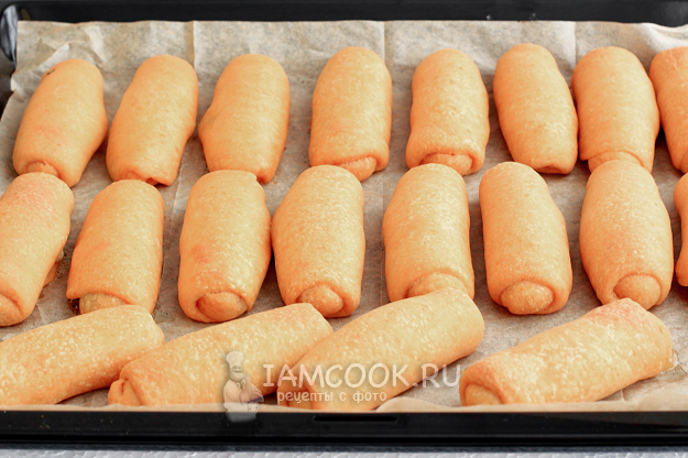 Сформируйте подобным образом все пирожки. Выровняйте их на столе, слегка прокатывая по твердой поверхности. Выложите на противень с силиконизированным пергаментом. Выпекайте в разогретой до 190-200 градусов духовке минут 20-25, ориентируйтесь по своей духовке.
