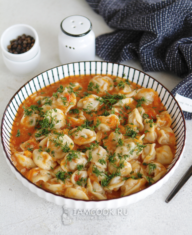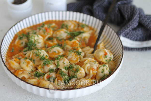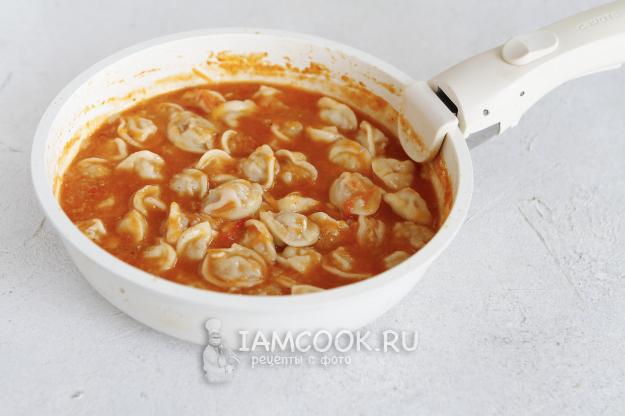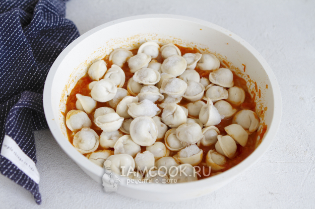 Добавьте в сковороду пельмени, размораживать их не надо.