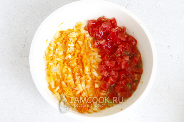 В глубокой сковороде разогрейте растительное масло. На небольшом огне обжарьте лук с морковью и чесноком до мягкости. С помидора снимите шкурку, нарежьте его квадратиком и добавьте к овощам. Продолжайте обжаривать еще минут 5. Практически до полного выпаривания жидкости.
