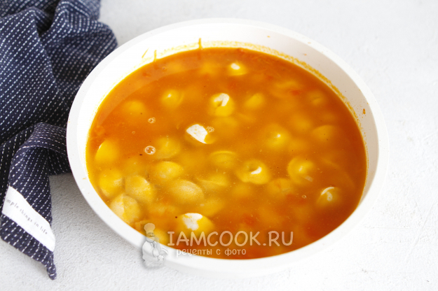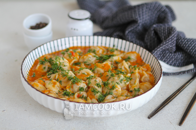 Следом влейте в сковороду горячую воду. Вода должна полностью покрывать все пельмени. Возможно, вам потребуется чуть больше.