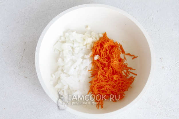 Овощи нарезайте произвольно. Лук репчатый и пару зубчиков чеснока я нарезала мелким кубиком, а морковь натерла на мелкой терке.