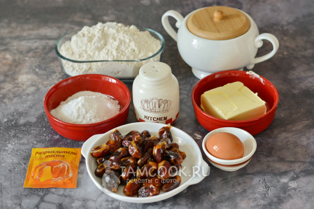 Для того чтобы испечь печенье с финиками, подготовьте все необходимые продукты по списку.