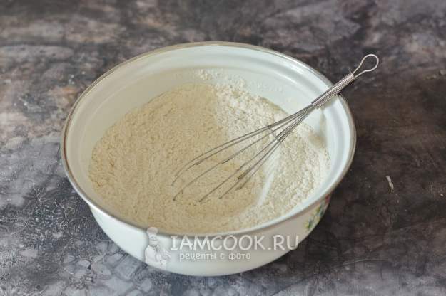 В миске соедините все сухие ингредиенты: оба вида муки, соль, сахар и разрыхлитель. Смешайте их тщательно венчиком.
