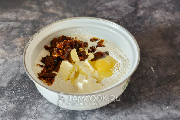 Добавьте нарезанное на кусочки масло, вбейте яйцо и добавьте нарезанные финики.