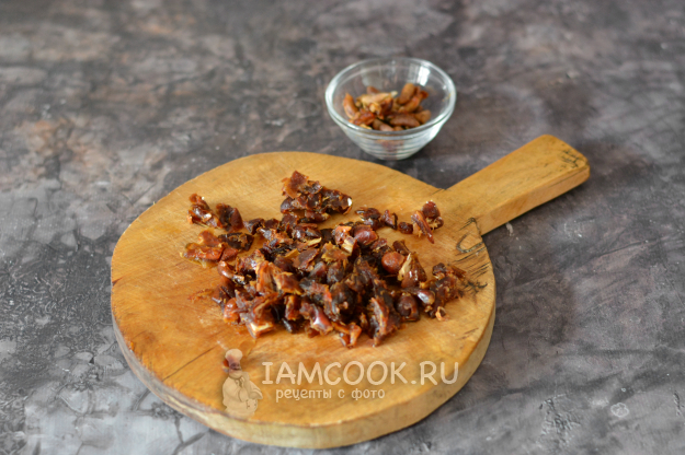 Финики вымойте и на 10 минут залейте теплой водой. После чего освободите их от косточек и нарежьте. Нарезайте на кусочки размером примерно с изюминку. Старайтесь не мельчить, так как при замесе теста мелкие кусочки просто размажутся по тесту.