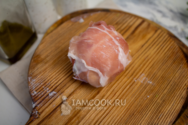 Поднимите края бекона к центру и заверните в него шампиньон.