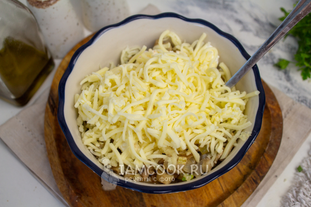 Добавьте натертый сыр и перемешайте начинку.